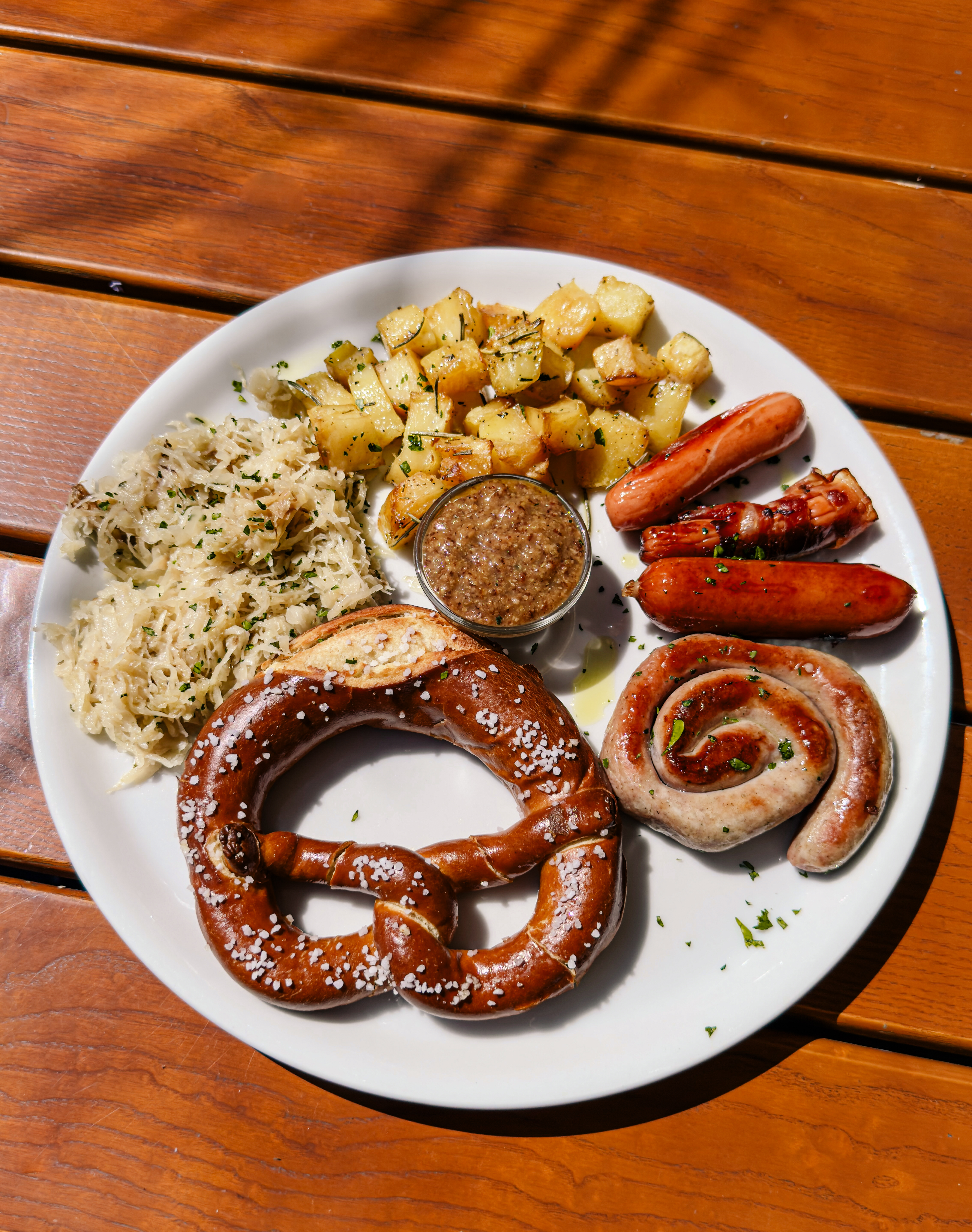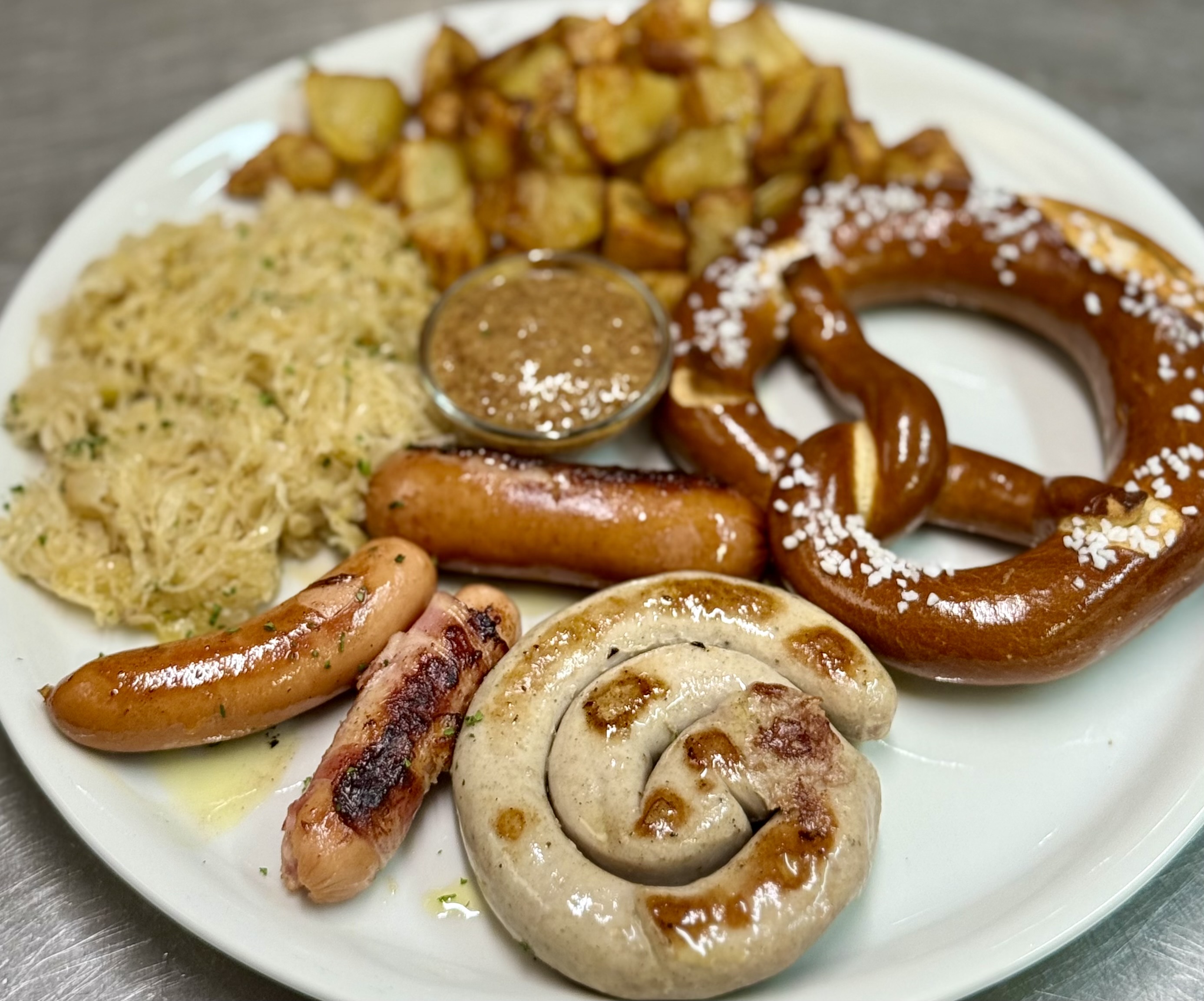 un viaggio nei sapori della Germania con quattro wurstel tipici, bratwurst chiocciola, frankfurter, kaesekrainer e berna, accompagnati da crauti, patate al forno, brezel e senape bavarese. Prost!
