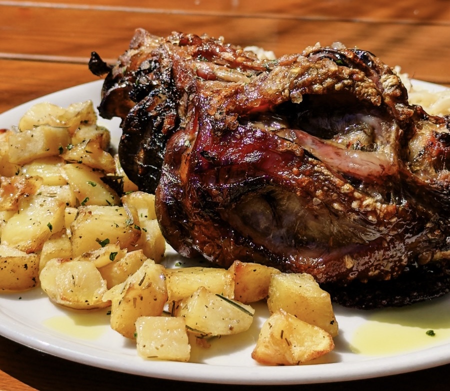 Specialità romana cotto alla perfezione sulla piastra, croccante all'esterno e succulento all'interno. Accompagnato da patate al forno espresse per un piatto ricco e gustoso.
