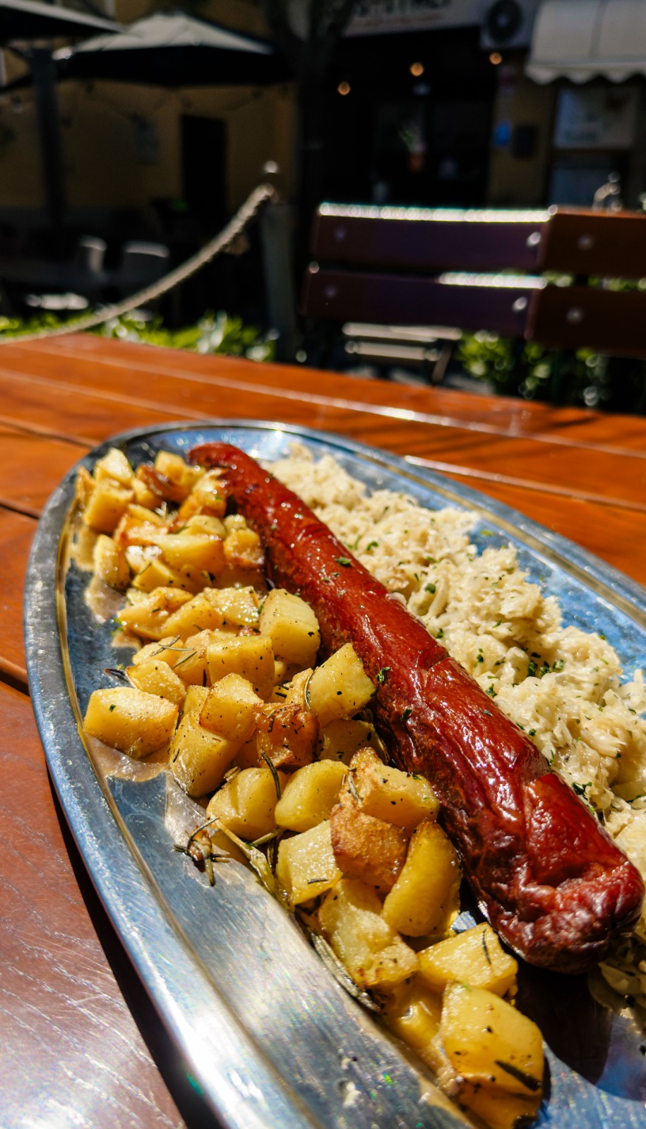 Il gigante della festa: würstel da 450 g e 43 cm di gusto, servito con crauti speziati e patate al forno.
