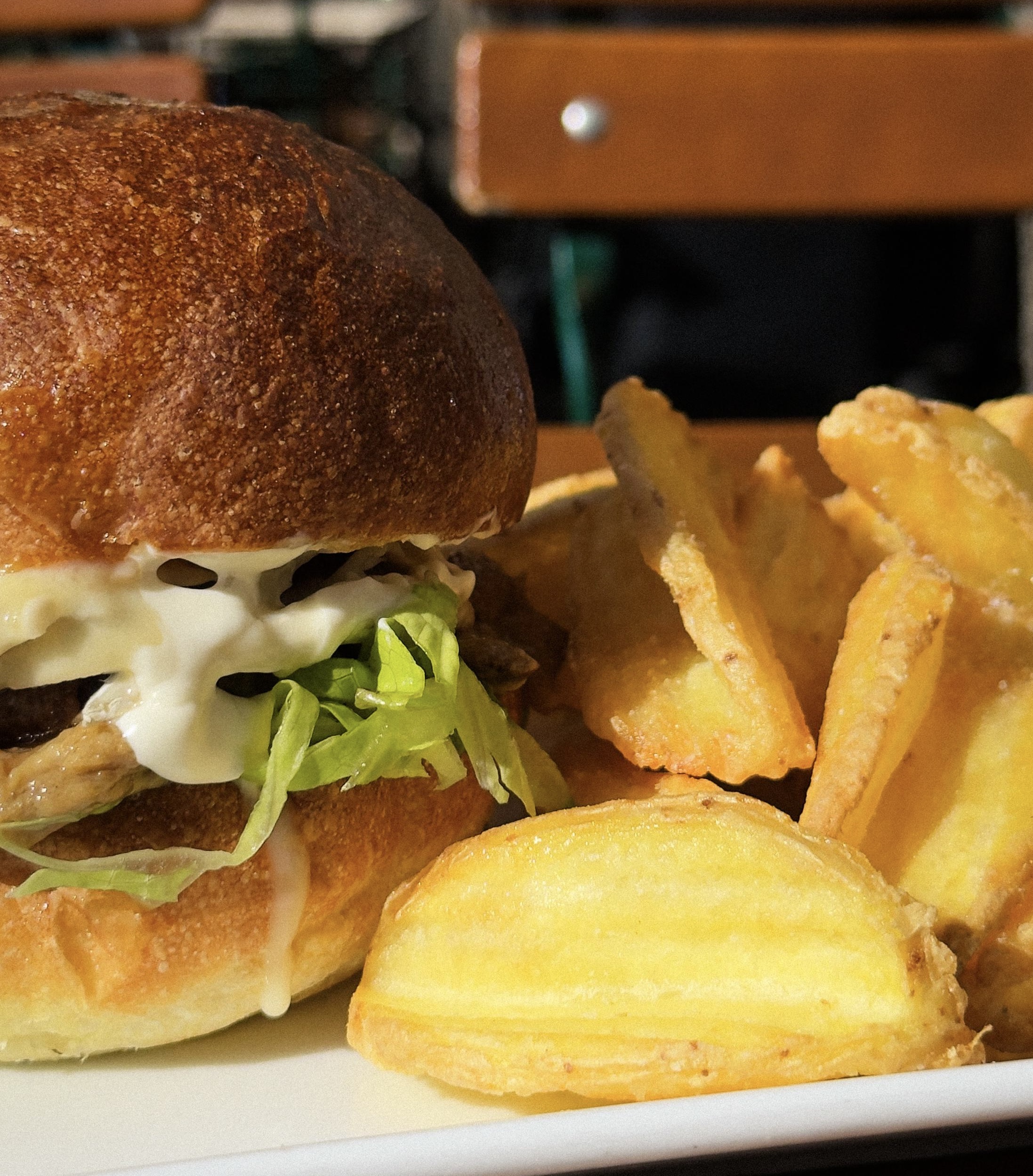 Hamburger da 180gr, porcini, brie, maionese affumicata e patatine crispy.